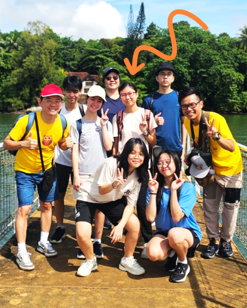 Mr. Joshua Lawrence and I, in yellow, with the rest of the wonderful participants for the guided nature walk in Pulau Ubin. Claire is indicated by the arrow pointing at her.