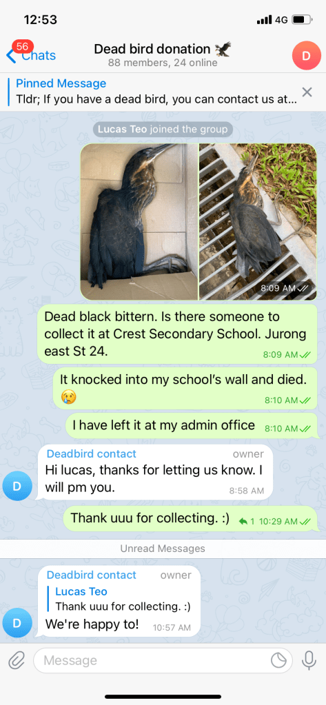 Thank you ACRES for your services and always seeking better ways to support your cause. And also to all others parties such as NPark’s Animal Response Centre as well as LKCNHM’s deadbird hotline services.