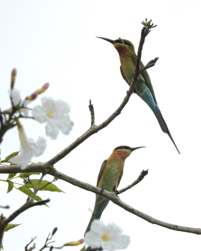 Notice that the Blue-Throated Bee-Eater also has a blue tail. Credit: Gabriel KangBlue-Tailed Bee-Eaters perched on a tree looking for their next victims in Lorong Halus.
